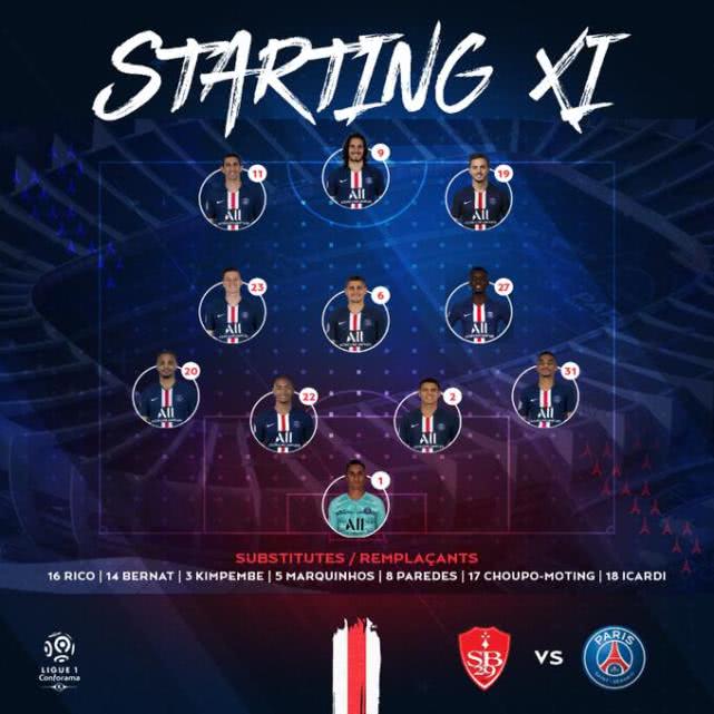 布雷斯特VS巴黎首发:卡瓦尼上台 姆巴佩缺阵伊卡尔迪替补