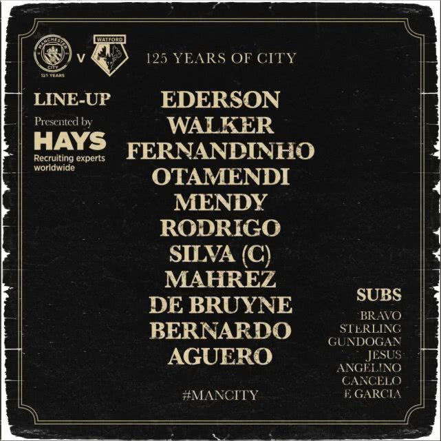 曼城VS沃特福德首发:阿圭罗突前 门迪复出
