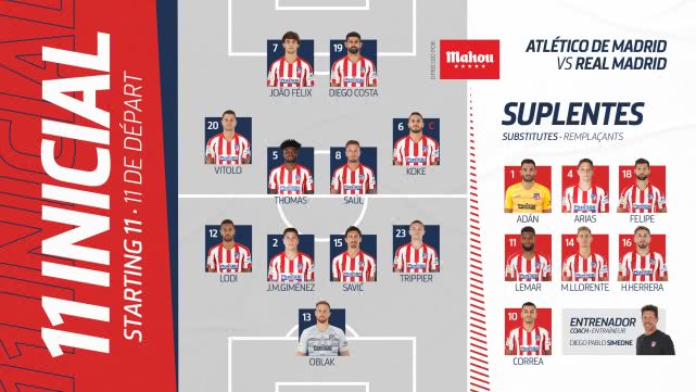 马竞VS塞尔塔首发:新C罗配科斯塔 科克坐镇